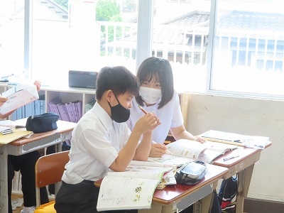 「be動詞の疑問形の作り方の復習を行っています。お互いに確認しながら授業が進んでいます。
