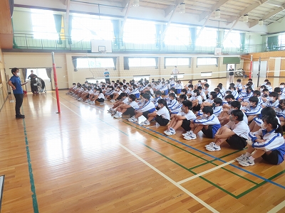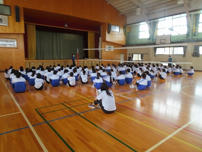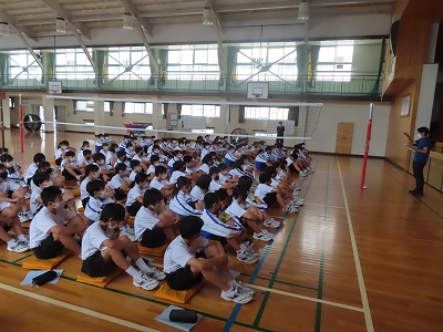 潮塾(自然教室)に向けて、昼休み、1・2年生が合同集会を実施しました。実行委員を募集し、後期に向けての組織作りを行っていこうという取り組みについて話がありました。