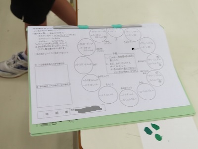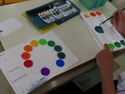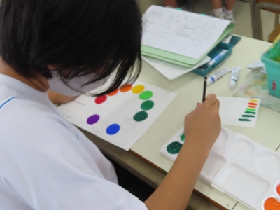 「色相環」を制作しています。平ぬりをして、○からはみ出さないように丁寧にぬり、絵の具を混ぜて、自分の納得のいく色を作り上げていました。