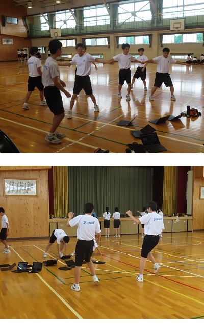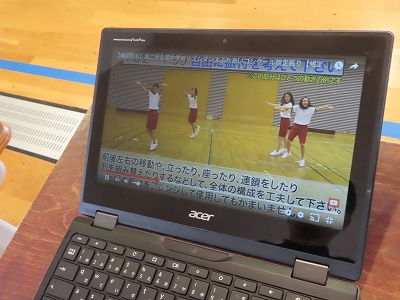 リズムダンスを行っています。全国リズムダンスふれあいコンサートの動画を見ながら、リズムに合わせて楽しく踊っています。