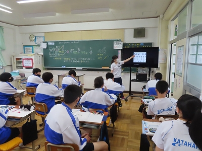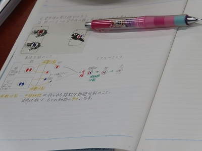 遺伝のしくみです。理科室があまりにも蒸し暑いため、まとめは教室で行っています。