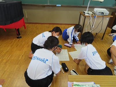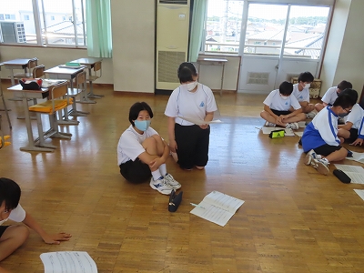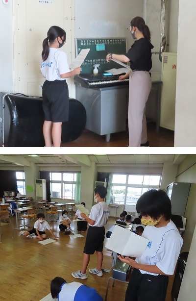 「朝の風に」という曲のパート決めを行っています。曲が流れている中で、自分で歌ってみて、ソプラノ、アルト、テノールのどのパートが歌いやすいか考えています。みんな楽しそうに歌っています。