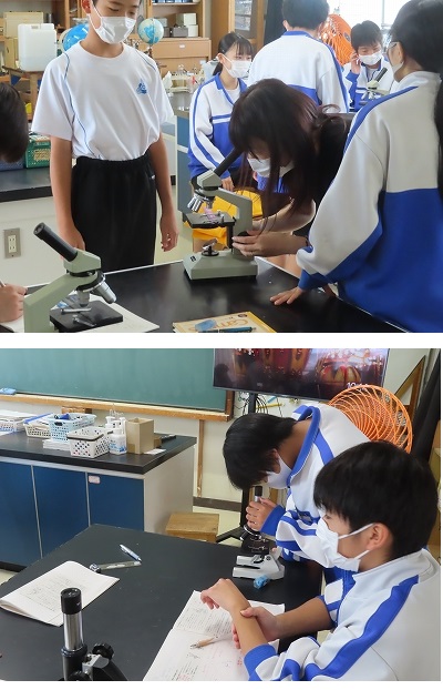 顕微鏡の操作の仕方を確認しています。定規を用いて、5を顕微鏡で見るとどのように見えるのか、見たいものを動かすときにはどうすればよいかなど、実際に顕微鏡を操作しながら確認しています。