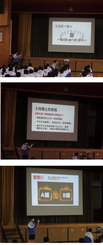 放課後生徒集会を実施しました。潮会について、生徒会長から、スローガン、目的、方法等の話があり、最後に合唱の歌う順番のくじ引きを行いました。