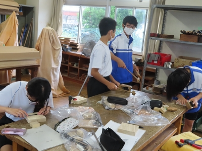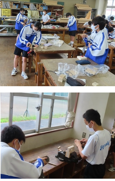 スタンドを製作しています。土台となる部分の穴を開けたり、カンナでヤスリがけをしています。
