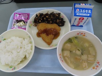 当初は「ひらつくねのあまからあんかけ」でしたが、臨時休校のため、アジフライに変更となりました。サクサクしていました。