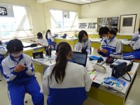 「細胞のつくり」について学習しています。植物と動物の細胞の作りのモデルから、共通点、相違点を見いだし、色分けしています。