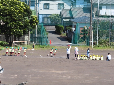 小諏訪幼稚園の園児さん達が、短距離走を行っています。みんな一生懸命です。かわいいですね。