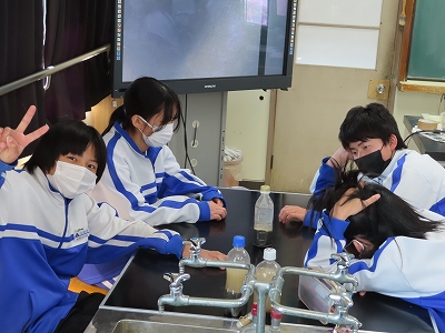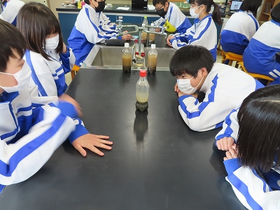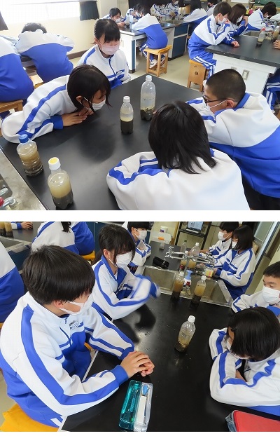 「地層」の学習です。前回の授業でとってきた砂の様子を見ています。地層ができているのか、またその規則性は何なのか、熱心に観察していました。
