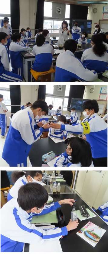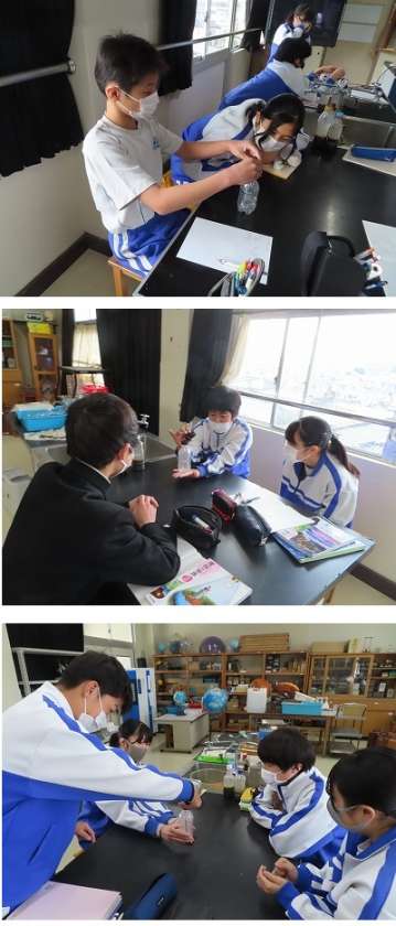 ペットボトルで雲を作っています。ペットボトル内が白くくもると、歓声が上がっていました。