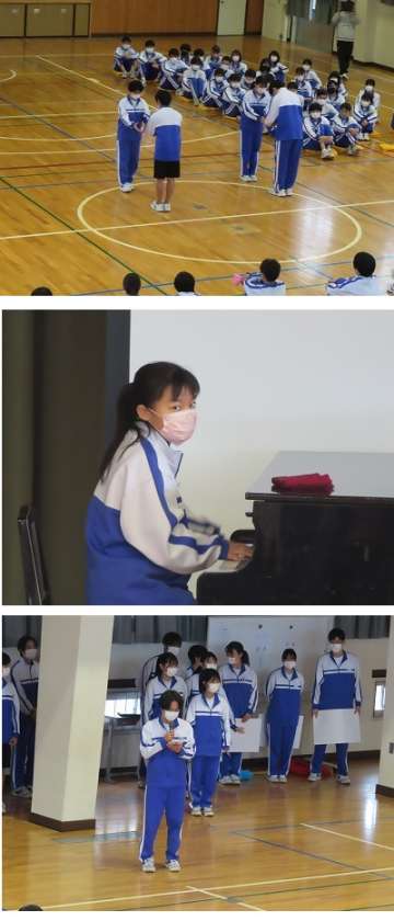 1・2年生からはボディーパーカッションのプレゼントです。コロナ禍のため、合唱に制限がかかっているため、ボディーパーカッションを心を込めて行いました。迫力満点でした。