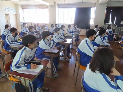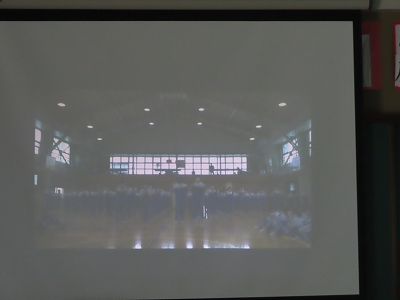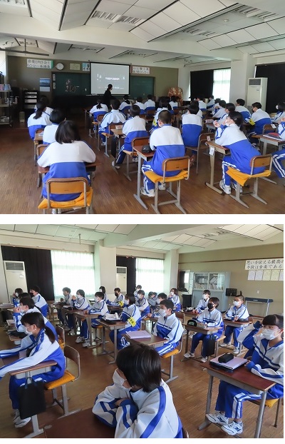 「3年生を送る会」で行ったボディパーカッションのようすを確認しています。はじめの頃に比べ、どんどんうまくなっていった様子がわかります。