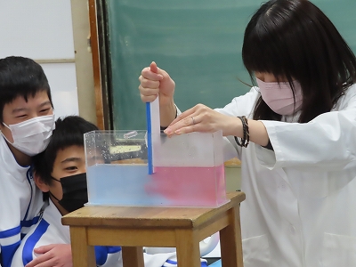 「前線」の学習です。「暖気と寒気がぶつかり合うとどうなるか。」実験を行って確かめています。境目がわかりやすいですね。