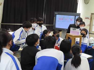「前線」の学習です。「暖気と寒気がぶつかり合うとどうなるか。」実験を行って確かめています。境目がわかりやすいですね。
