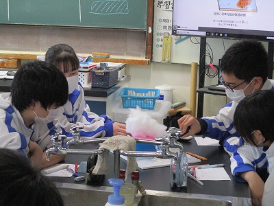 2B理科:寒冷前線のしくみについて模型を用いて学習しています。綿は湧き上がる雨雲です。