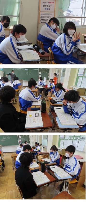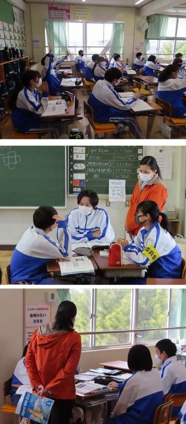4人グループになって、英会話を行っています。ALTの先生も参加しています。