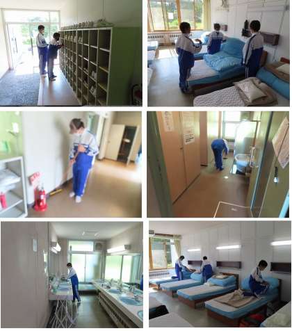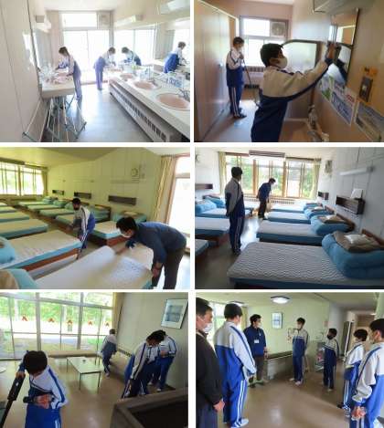 部屋を出る前にみんなで清掃を行っています。シーツのたたみ方などにも気を配ったり、トイレや洗面台などの水回りも丁寧に清掃していました。