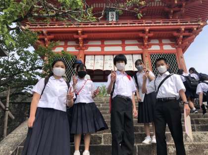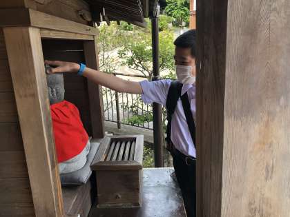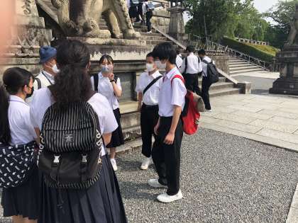 続々と各班が清水寺に集合してきました。首振地蔵は、会いたい方向に首を向けて願うと叶うそうです。彼は誰に会いたかったのでしょうか?