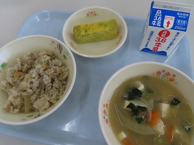 今日の給食は和食です。厚焼き玉子には、鰹だしや昆布だし等いくつかの調味料が入っていて、おいしかったです。