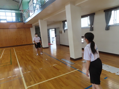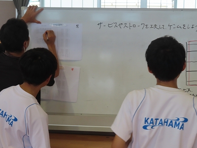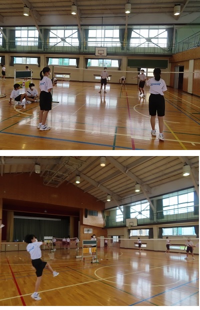 バドミントンを行っています。対戦相手を決めて、試合形式で行っています。