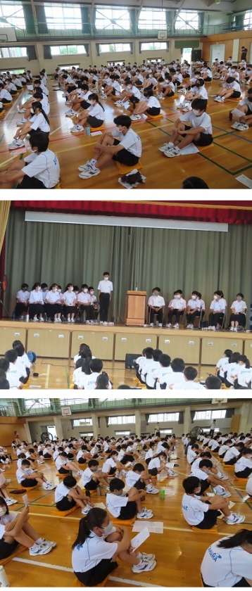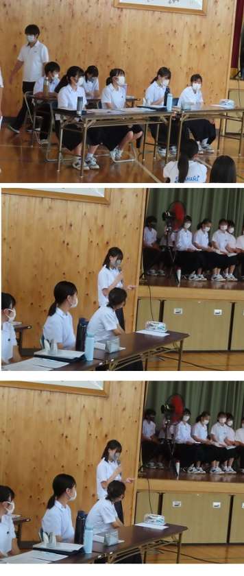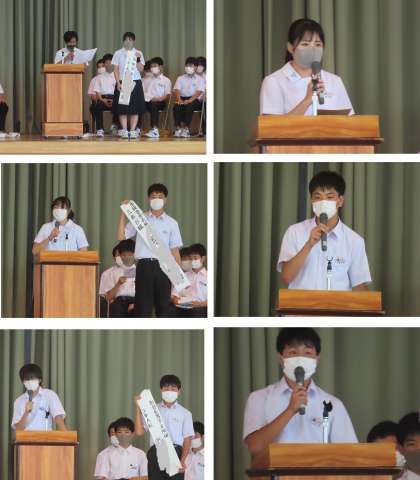 6時間目には、後期生徒会役員選挙の立ち会い演説会を実施しました。体育館が厚かったため、窓を開けての換気や大型扇風機の使用、合間での水分補給等に気を遣いながら実施していきました。
