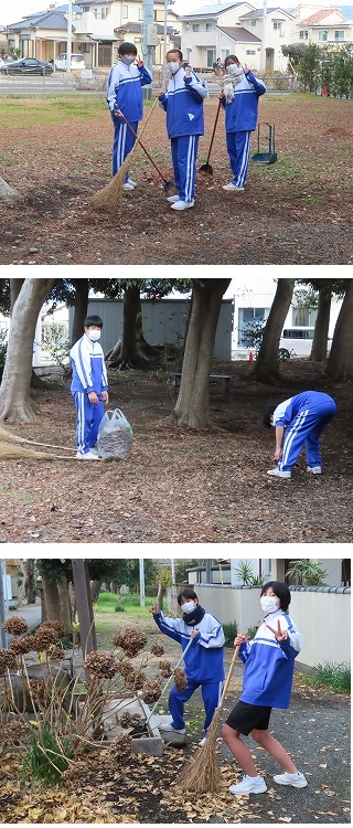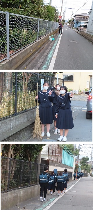 朝のようすです。小諏訪神社で落ち葉はきをしています。