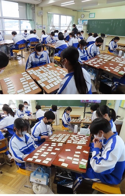 百人一首を行っています。上の句だけでとろうと、暗記した成果を発揮しています。