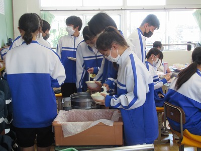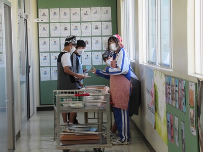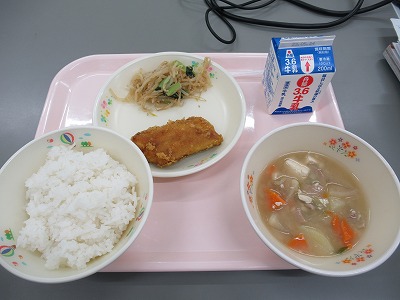 今日の給食の献立は、ごはん、牛乳、サワラのカレー揚げ、もやしのごま酢あえ、豚汁でした。3年生の配膳の様子です。