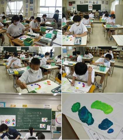 色相環について学んでいます。見本を見ながら、絵の具を混ぜて自分がつくりたい色を作っています。絵の具箱にある色をどう組み合わせると、どんな色ができるのか試行錯誤です。「4つのみどり色をつくるのが難しい・・・。」ようです。
