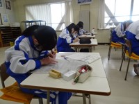 3年B組は美術です。篆刻を作成しています。自分が紙に描いてイメージした印章や持ち手等を、実際に彫り進めていました。持ち手にかなりこだわり、それぞれが工夫を凝らしていました。