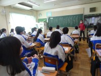 2年B組は英語です。暗唱した課題文のテストです。いろいろな仲間と覚えた文を言い合い、自信をつけてからALTや担当教員のところにチャレンジに向かっていました。