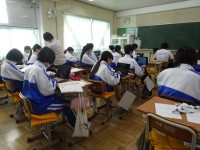 1年B組は数学です。関数の比例・反比例の学習のまとめです。共通点や相違点、特徴などをそれぞれでまとめています。近くの仲間に声をかけたり、教科書を見直しながら、まとめを進めていました。