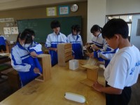 1年B組は技術家庭の技術分野です。本立ての制作がかなり進んできました。組み立ての最終段階、磨き、ニス塗りと進度は様々ですが、必要なところは互いに手伝いながら作業を進めていました。