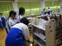 2年A組は国語です。生徒、教員アンケートにより、JRCからの寄贈本として新しい本が63冊入りました。ビブリオバトルをこれから行うことを考えているので、今日はその選定も兼ねています。