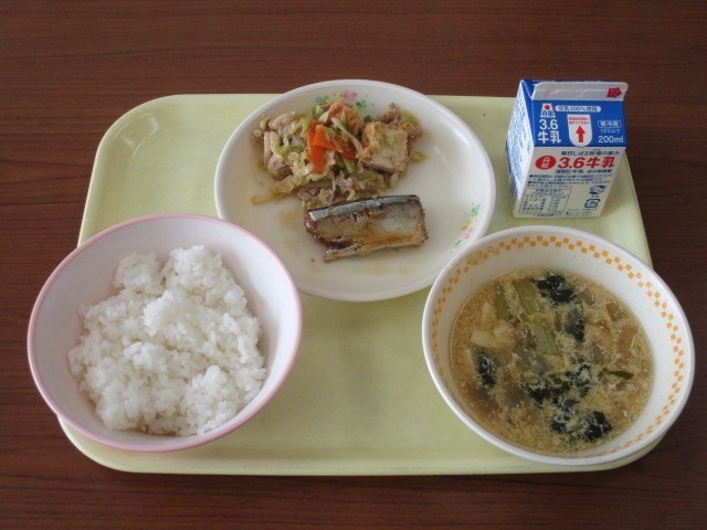 給食 今日の給食は「米飯」「牛乳」「さんまの生姜煮」「厚揚げと豚肉の味噌炒め」「かきたま汁」です。今年のさんまは豊漁で、脂ののりもよく、サイズも大きいということです。今日の給食もおいしくいただきましょう。
