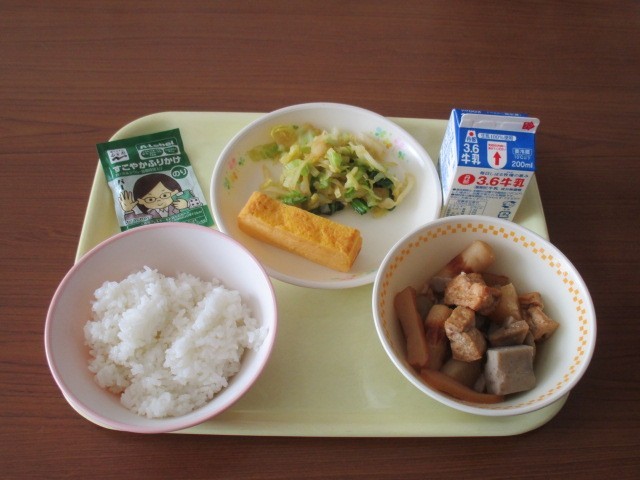 今日の給食は「米飯」「牛乳」「静岡おでん」「厚焼きたまご」「おひたし」「のりふりかけ」です。静岡おでんは、牛すじ、黒はんぺん、大根、卵などの具材を串に刺し、黒いだし汁で、青のりや魚のだし粉をかけて食べる料理です。今日の給食もおいしくいただきましょう。