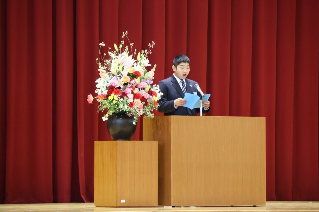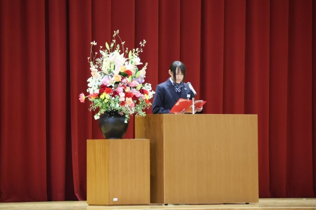 2年生、3年生代表生徒による「2学期を振り返って」です。校長先生から、「豊かな心をもち 自立を目指す たくましい子」の中のたくましいのとらえについて、ロケット打ち上げの失敗やサッカー選手の負傷を例に、絶望からの立ち直り、顔を上げて臨んでいくことの価値について話がありました。