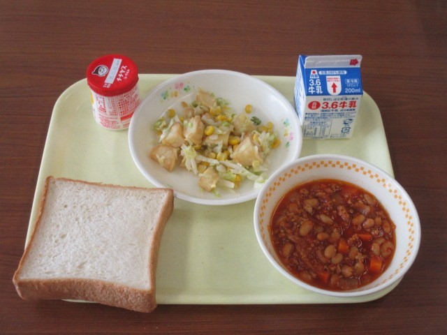 今日の給食は「食パン」「牛乳」「チリコンカン」「ポテトと野菜のソテー」「ヨーグルト」です。チリコンカンは、牛ひき肉や細かくカットしたタマネギを炒めて、インゲン豆などの水煮やトマト、ピーマン、チリパウダーなどを加えて煮込んだメキシコ料理に由来するアメリカの郷土料理です。今日の給食もおいしくいただきましょう。