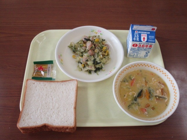 今日の給食は、「角形食パン」「メイプルジャム」「牛乳」「ウインナーと野菜のソテー」「かぼちゃの豆乳シチュー」です。かぼちゃには、カリウム、βカロテン、ビタミンC、食物繊維などの栄養素が含まれています。今日の給食もおいしくいただきましょう。