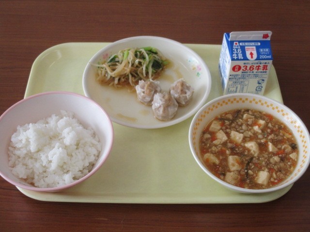 今日の給食は「米飯」「牛乳」「マーボードウフ」「ポーク焼売」「ナムル」です。日本のマーボードウフは、一般的に比較的マイルドな味付けで、辛さはあまり強くありませんが、中国は、豆豉(とうち)豆板醤(とうばんじょう)、花椒(ファージョウ)などの辛い調味料や香辛料を使用するため、ピリ辛です。今日の給食もおいしくいただきましょう。