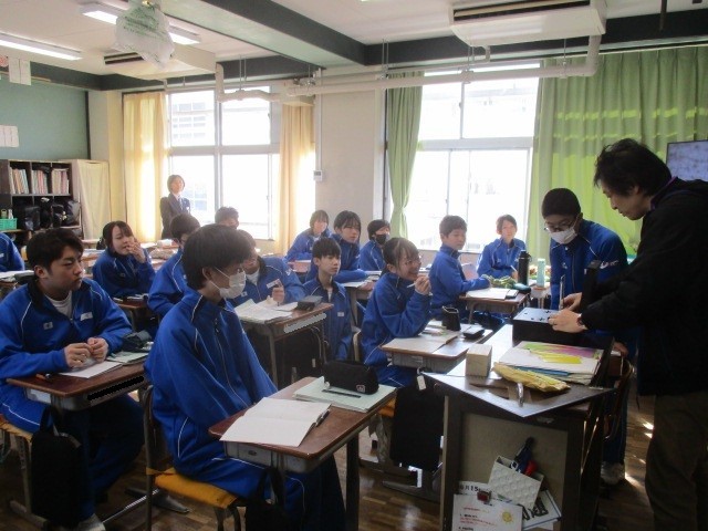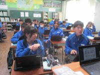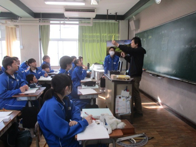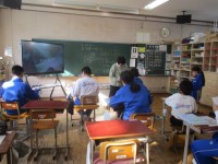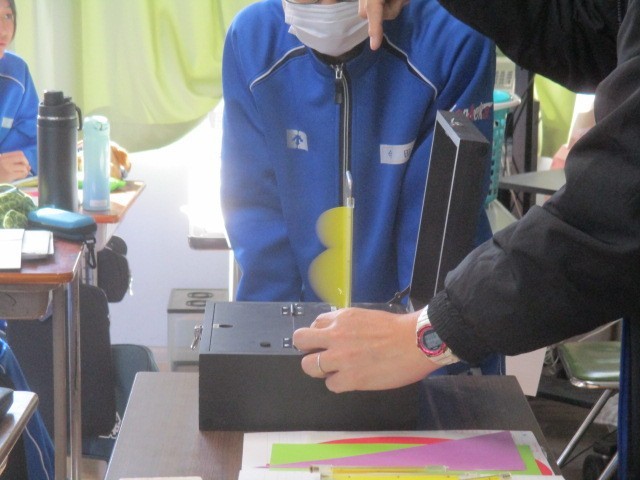1年数学では、回転させてできる立体、回転体の学習です。平面を回転軸を中心として回転する装置によって、残像で立体が見えてきます。この写真画像では見えませんね。