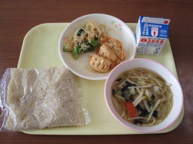 今日の給食は「中華麺」「牛乳」「塩ラーメン」「揚げ餃子」「ナムル」です。人気のラーメン味ラインキング、ある調査によると、第1位 塩ラーメン、第2位 醤油ラーメン、第3位 味噌ラーメン、第4位 とんこつラーメン 第5位 担々麺 とありました。みなさんは何味が好きですが?今日の給食もおいしくいただきましょう。