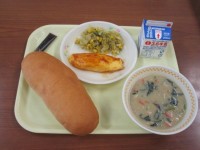 今日の給食は、「米飯」「牛乳」「肉豆腐」「キャベツとキュウリのサラダ」です。肉豆腐は、豆腐がメインの料理で牛肉や豚肉の細切れ、長ネギや玉ねぎ、白菜などを味付けした料理です。今日の肉は豚肉です。おいしくいただきましょう。