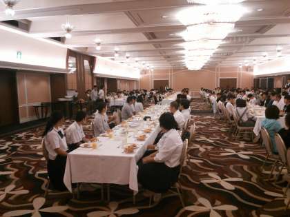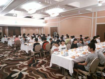 朝の集いで朝食会場に集まりました。実行委員から注意事項が連絡されました。