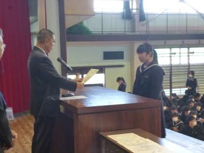 ジュニア県展書写の部で入選した生徒代表の表彰の様子です。