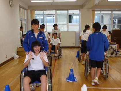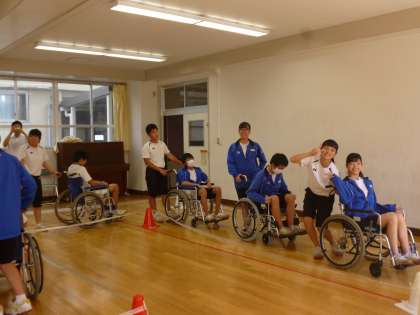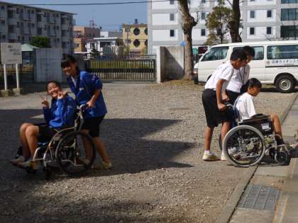 3年生の総合的な学習の時間のテーマ「福祉」の一環として、車椅子体験を行っています。