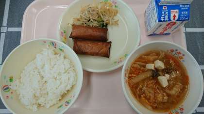 今日のメニュー ○ごはん ○牛乳 ○春巻き ○もやしのナムル ○豚キムチスープ