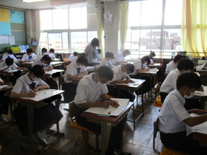 本日は定期テストの初日です。5つの教科のテストに取り組みます。2年生のようすです。