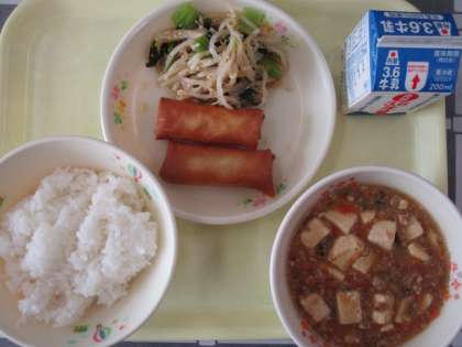 今日のメニュー ○ごはん ○牛乳 ○麻婆豆腐 ○春巻き ○ナムル