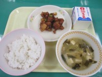 今日のメニュー ○ごはん ○牛乳 ○鶏肉の唐揚げ ○ごぼうのきんぴら ○白菜と大根のみそ汁